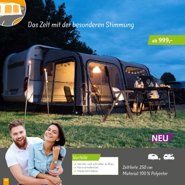 Das Zelt mit der besonderen Stimmung ab 999,– Vorteile c c leichter und schneller Aufbau c c Panoramafenster Zelttiefe: 250 cm c c Dauerventilation Material: 100 % Polyester 44